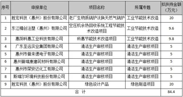 据公示附件“2021年惠阳区节能专项资金项目拟安排表”内容,获得嘉奖的项目共有三个专题类别,分别为:工业节能技术改造、清洁生产审核项目和绿色制造项目,分别有3项目、5项目和1项目。其中JDB电子游戏科技(惠州)股份有限公司的老厂生物质锅炉汰换天然气锅炉,东江精创注塑(惠州)有限公司的空压机余热回收系统工程节能技术改造项目等3项目为工业节能技术改造;JDB电子游戏科技(惠州)股份有限公司的绿色设计产品为绿色制造项目;惠州普瑞康建筑材料有限公司、广东至远实业集团有限公司等5企业的清洁生产审核项目为清洁生产审核项目。